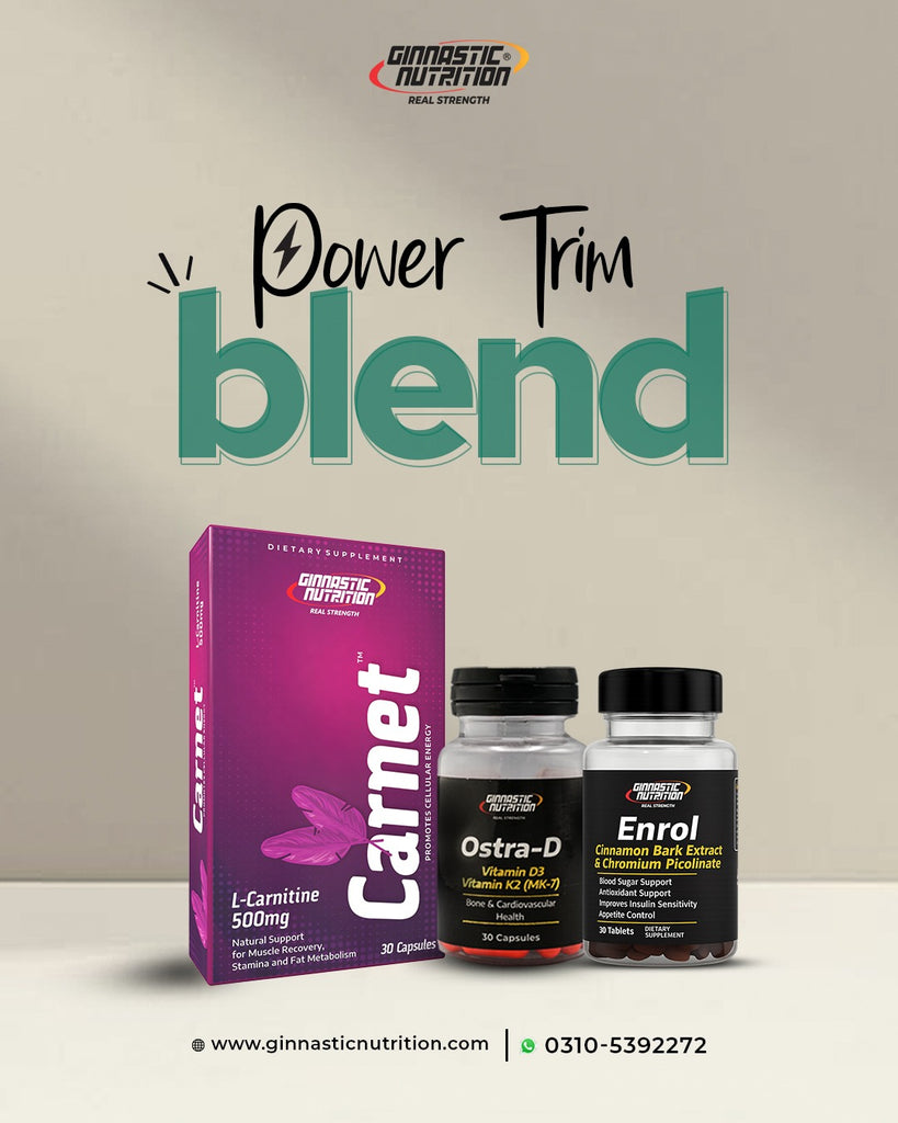 Power Trim Blend brings together three premium supplements that work in synergy to support energy, metabolism, and overall well being. This carefully formulated combination includes Enrol, Carnet, and Ostra D, each selected for its proven role in fat metabolism, blood sugar balance, and physical performance.